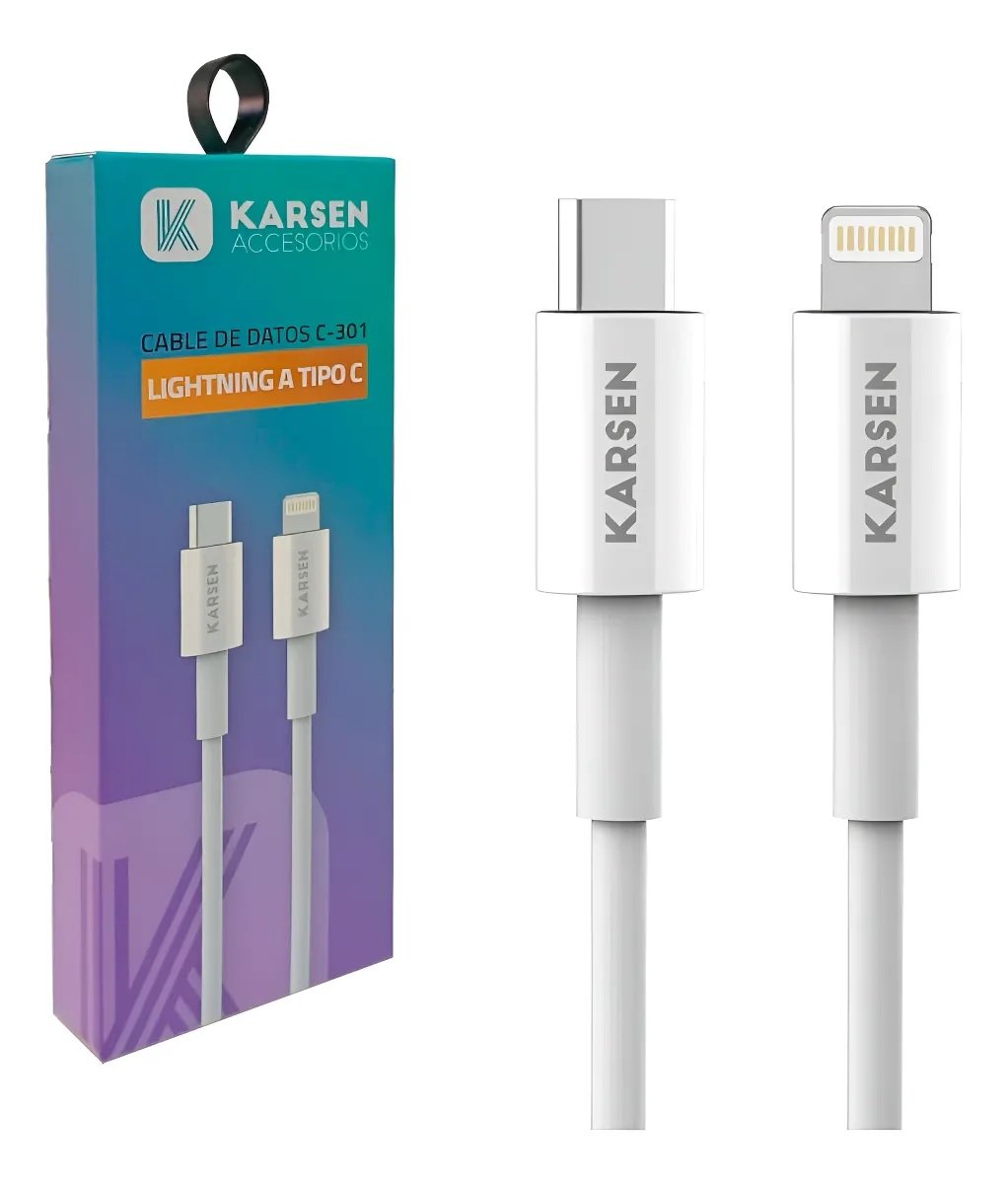 Características Principales: CABLE USB-C A entrada de celular apple iphone MARCA: Karsen C-301 USB-C A entrada de celular apple iphone CARGAR Y TRANSMISION SUPER RAPIDA PD20W LARGO: 1M